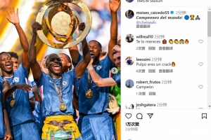 凯塞多社媒晒出举起奖杯的照片,庆祝球队夺冠,配文:“世界冠军!”